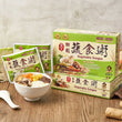 以台灣牛蒡為基底,搭配蔬菜、香菇、木耳、豆腐皮及糙米等,通ISO 22000、HACCP、HALAL國際食品驗證。每包120Kcal,純素食、低脂肪,適合早中晚餐的輕食粥,沖泡後味香鮮美,有不同層次的口感。